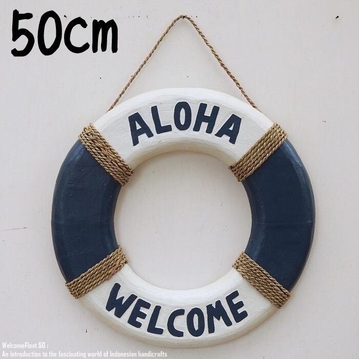 浮き輪のウェルカムボード 50cm 白青 ラウンド 円形 ウェルカム サインボード 壁掛飾り ハワイアン雑貨 バリ雑貨 アジアン雑貨 円型 丸型 ホワイト ブルー ナチュラル リゾート ボヘミアン エスニック アジアンインテリア バリ島