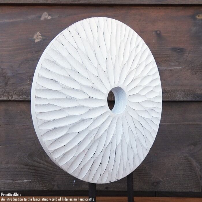 アジアンテイスト オブジェ [光] 35cm 木製装飾 ホワイトウォッシュ 手彫り 円形飾り 円盤オブジェ 木彫り アジアンテイストアート 土台付 装飾品 芸術品 木製 ウッド 置物 バリ雑貨 アジアン雑貨 バリ島 バリ風インテリア エスニック アジアンインテリア