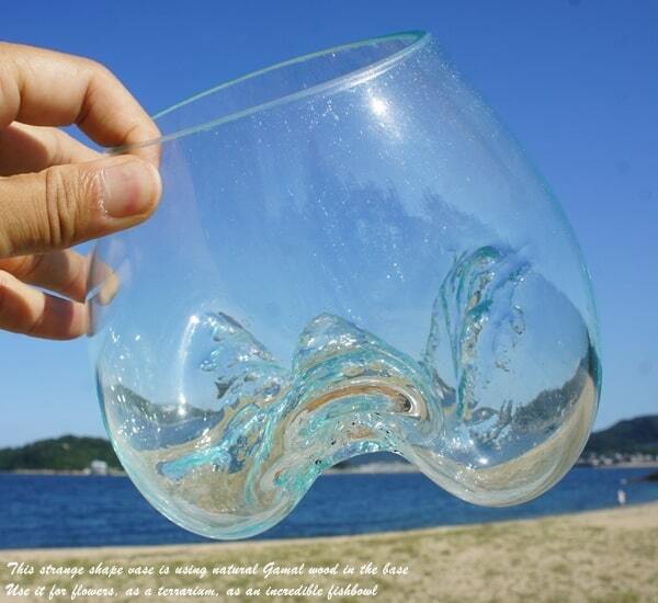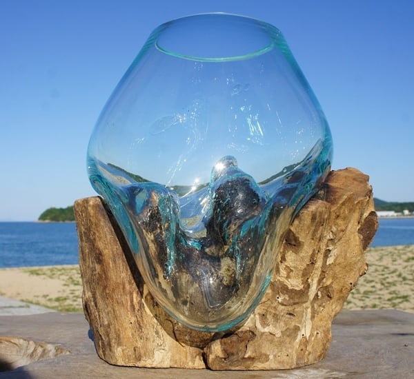 高温に熱したガラスを吹きガラスの技法で天然木の台座に押し当て、自然に流れ落ちるフォルムのまま成形した芸術的でインパクトのある作品。