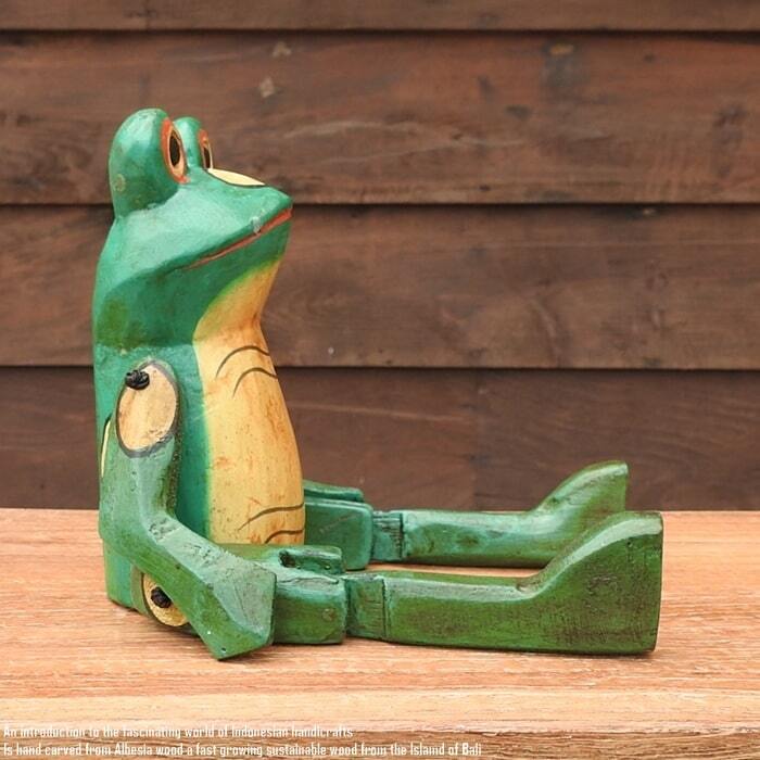 バリ島の職人さんが1点ずつ手彫りして手塗りした、お座りカエルさんの黄みがかったお色のSサイズモデルです。