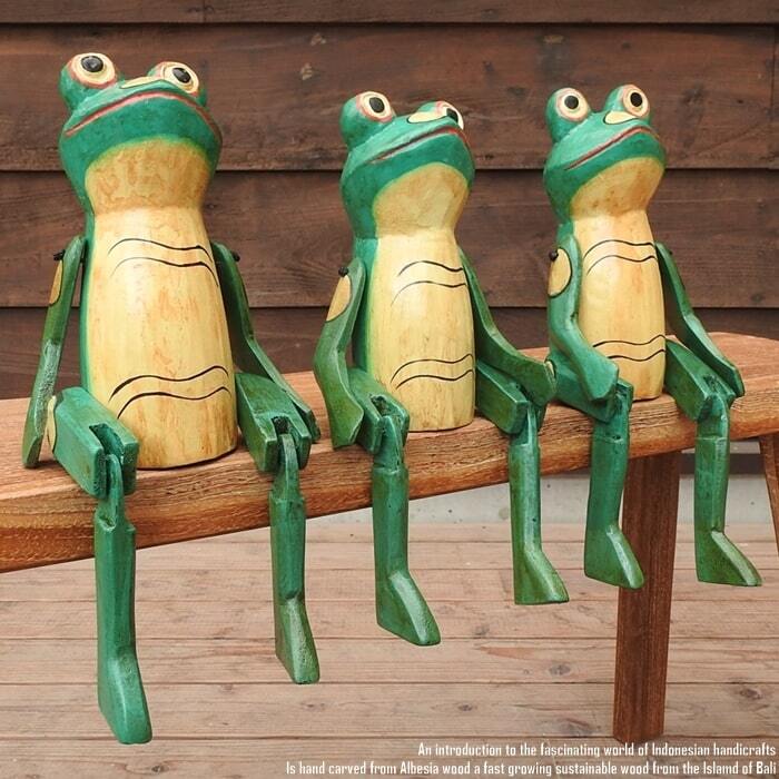 バリ島の職人さんが1点ずつ手彫りして手塗りした、お座りカエルさんの黄みがかったお色のMサイズモデルです。