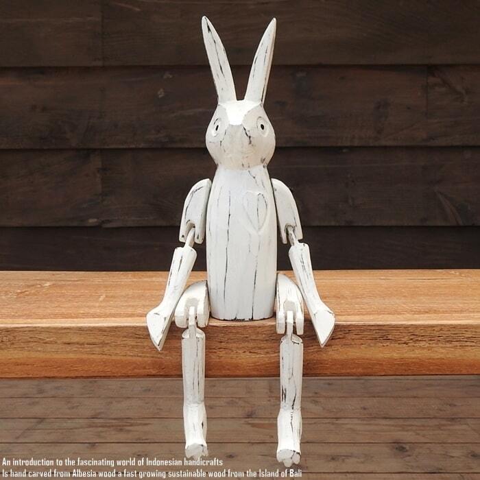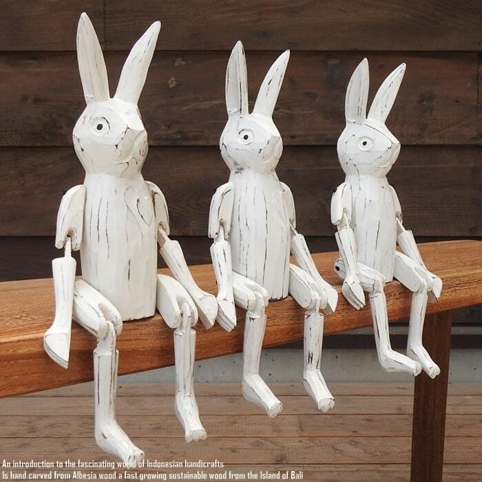 お座り うさぎさん 白 Mサイズ 手足が動かせる木彫りの動物 ウェルカム人形 兎 ウサギ 木製 ウッド 天然木 木彫りの置物 ハンドメイド 動物インテリア バリ雑貨 アジアン雑貨 動物置物 木製オブジェ エスニック アジアンインテリア バリ島