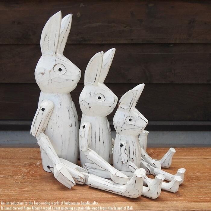 バリ島の職人さんが1点ずつ手彫りして手塗りした、お座りうさぎさんの白のMサイズモデルです。