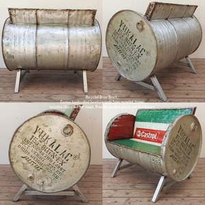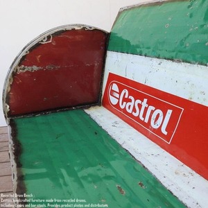 ドラム缶をリメイクしたベンチ 2P S Castrol カストロール 2人掛け 1.5人掛け 1人掛け スチール椅子 リメイク家具 工業系 男前家具 鉄脚 店舗什器 ドラム缶チェア ソファー アイアンチェア リサイクル 古材 デザイン家具 いす 業販 卸